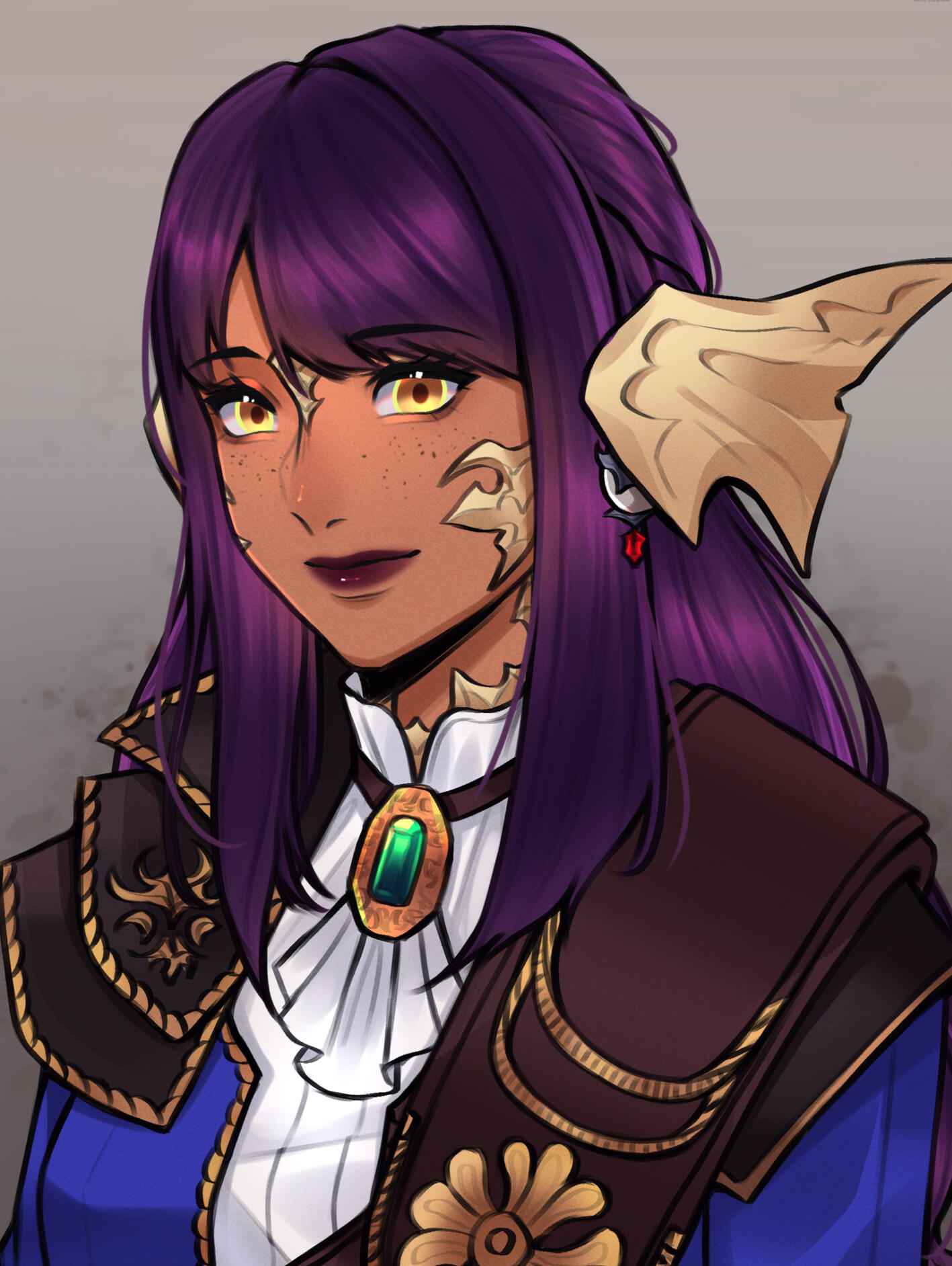 Small even by auri standards, Dagny stands at 4fms, 9im in height. Her skin is a medium brown color with freckles across her cheeks and shoulders and relatively unblemished save for a scar down her back from her first encounter with Zenos viator Galvus. With very little muscle tone in general, her skin is very soft, in part thanks to rigorous self-hygiene routines. Being a raen, she has bone-white scales on her body, with her horns in a fish fin shape. Dagny’s tail is forked and short while also somewhat thick. It is often flicking this way and that, an easy indicator for those that know her well what she might be thinking or what her mood is.Dagny’s hair is a deep purple color and is naturally wavy, especially when kept in longer lengths. It's texture would be best described as feathery. Sometimes it is treated with alchemical solutions to straighten it. It is often accessorized originally with a flower and then, as she grows older, a ribbon–starting with a red one gifted to her by Alisaie. Her eyes are a light golden color with bright yellow limbal rings, which stand out even more thanks to her habitual heavy application of eyeliner and eyeshadow. Dagny is also fond of wearing dark colored lipstick, along with painting her nails, usually in colors to match her outfits.Her sense of fashion drifts unusually towards elegance for an adventurer, and Dagny largely prefers skirts to pants. Black is easily the most common color in her wardrobe, though she was known for a bright, hooded white robe during her early days as the Warrior of Light. In addition, she gravitates towards fabrics that are deep shades of red, purple, and blue, though she will wear other colors when the mood strikes her. A large linkpearl hangs behind her left horn in a moonlet earring style.After the defeat of Endsinger and bringing peace to Etheriys, her eyesight has taken a slight turn for the worse. Dagny can sometimes be found wearing glasses for reading, though she feels that claims from others that she needs them are exaggerated.